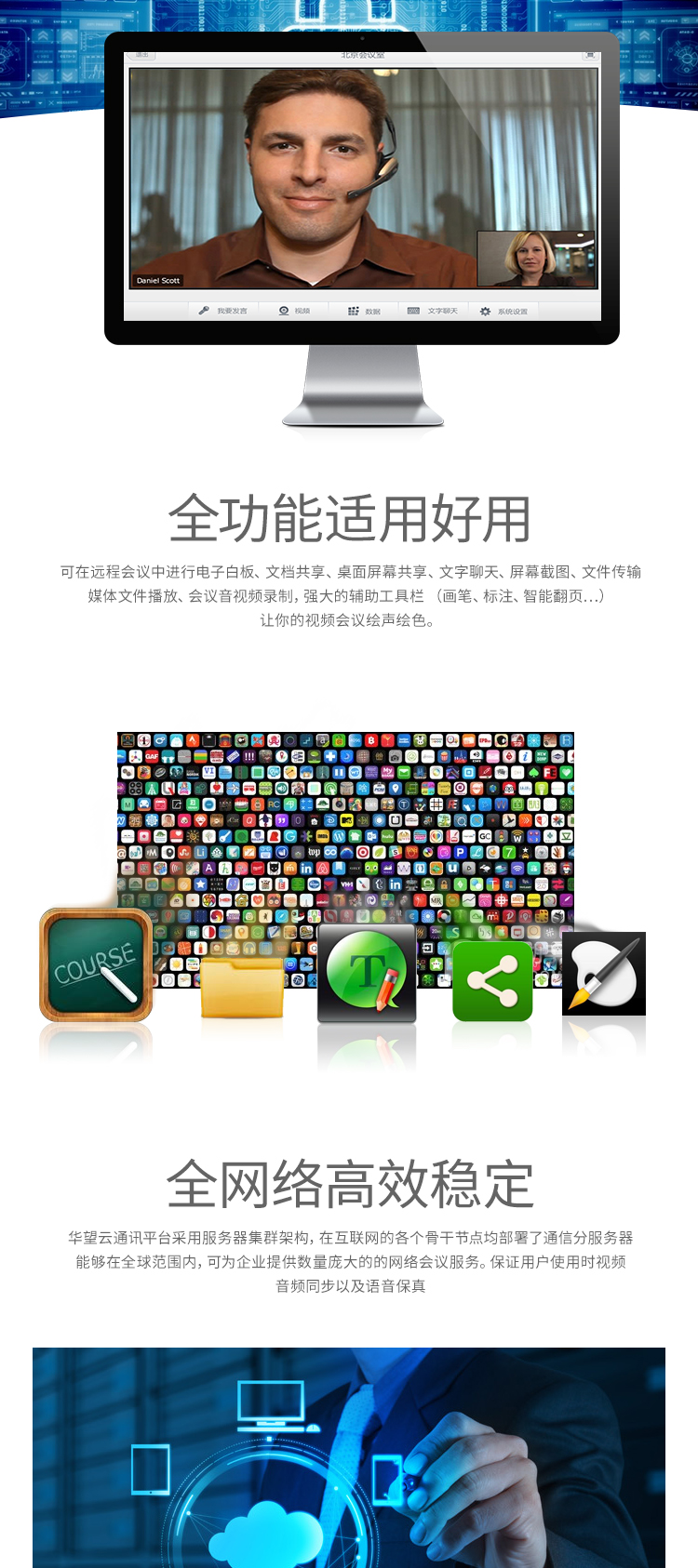 視頻云平臺產品特性:最穩(wěn)定的音視頻通訊云平臺,能為用戶提供包括語音、視頻、文檔、影音、屏幕等多種媒體方式的遠程視訊服務。最穩(wěn)定的遠程音視頻服務系統(tǒng),全網絡高效平穩(wěn)運行;1080P全高清視頻,音頻高保真,